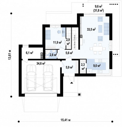 Плоская кровля: Плоская кровля, в сочетании с широкими свесами, не только придает дому современный вид, но и обеспечивает надежную защиту от осадков. Она также позволяет создать на крыше дополнительную функциональную зону, например, террасу или зону отдыха.